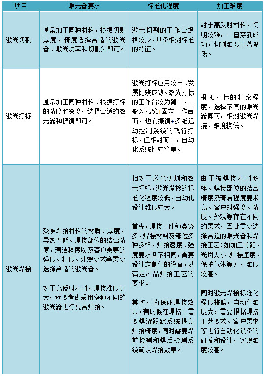 激光焊接與激光切割和激光打標相比,前者的發(fā)展時間相對較短,其工藝難度也大于激光切割和激光打標。激光切割和激光打標是利用激光將物質的表面結構或整體結構破壞,而激光焊接是利用激光將物質的結構進行加工熔融并重新構筑。物質構筑相較于簡單的物質結構破壞,對激光器及加工工藝的要求更高。