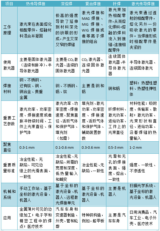 根據(jù)工作原理的不同,適配不同的加工場景,激光焊接可分為熱傳導焊、深熔焊、復合焊接、激光釬焊和激光傳導焊接五種,具體如下: